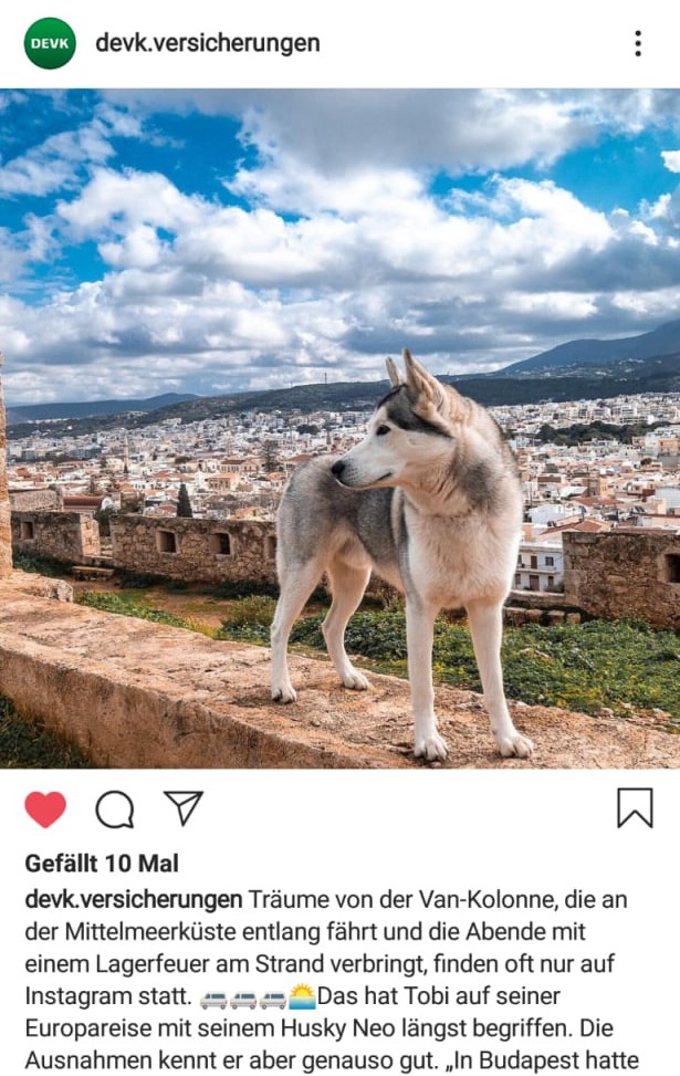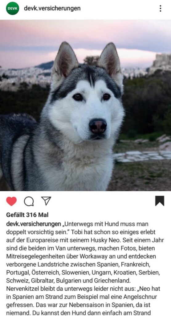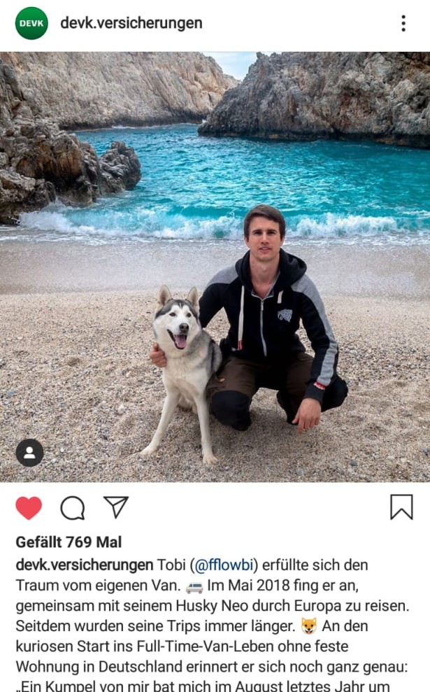 Im gleichen Zeitraum im Frühjahr 2019 ergab sich eine weitere bedeutsame Partnerschaft mit der DEVK. Diese renommierte Versicherungsgesellschaft zeigte Interesse an unseren Geschichten und Abenteuern, um sie auf ihrem Instagram-Account zu teilen. Die Kooperation mit der DEVK ermöglichte es uns, nicht nur unsere Campervan-Abenteuer und Reiseerfahrungen zu teilen sondern auch 3 tolle Fotos von Neo und auch mir, welche von der PR Abteilung sorgfältig ausgesucht wurden.